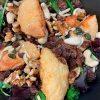 Ensalada de lechuga con queso frito, frutos secos y vinagreta de miel