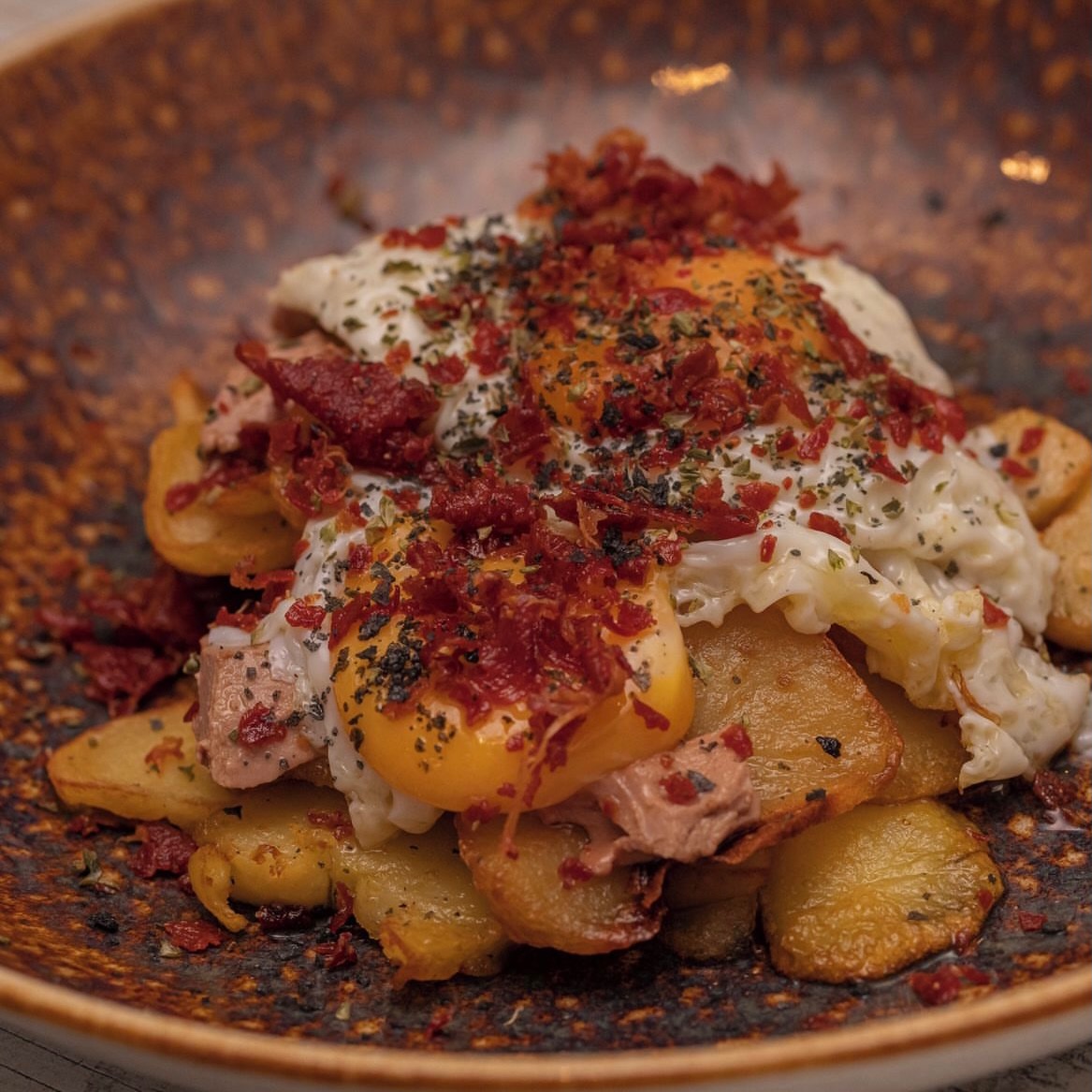 Huevos rotos a baja temperatura con mousse de foie, trufa y jamón deshidratado