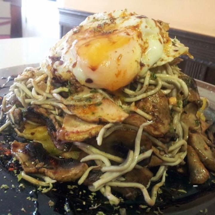 Huevos rotos con salteado de gulas, champiñones y langostinos con mayomiel
