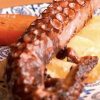 Pulpo súper tierno a la brasa con parmentier de patatas, aceite de pimentón, tomate al horno y pimiento del padrón
