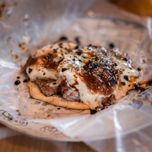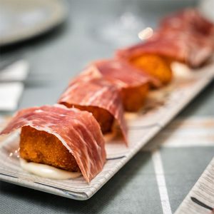 14,90 €Torta de aceite Inés rosales, solomillo a la brasa, crema de queso payoyo y confitura de higos