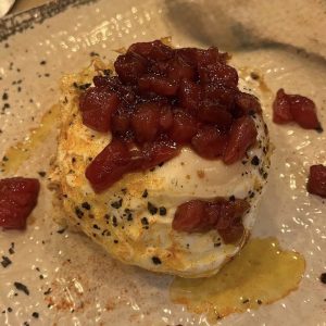Torta de aceite Inés rosales, solomillo a la brasa, crema de queso payoyo y confitura de higos