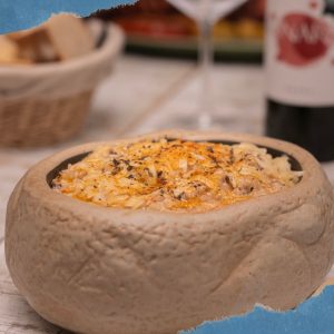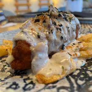 Huevos rotos con salteado de gulas, champiñones y langostinos con mayomiel