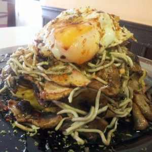 Fideos chinos con presa ibérica (o langostinos), verduras con teriyaki y queso parmesano