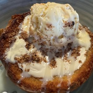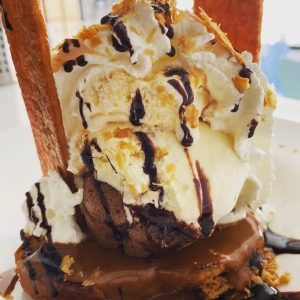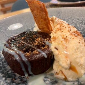 Torrija caliente con dulce de leche, coulant de chocolate, helado de praliné y galleta caramelizada – 2 personas